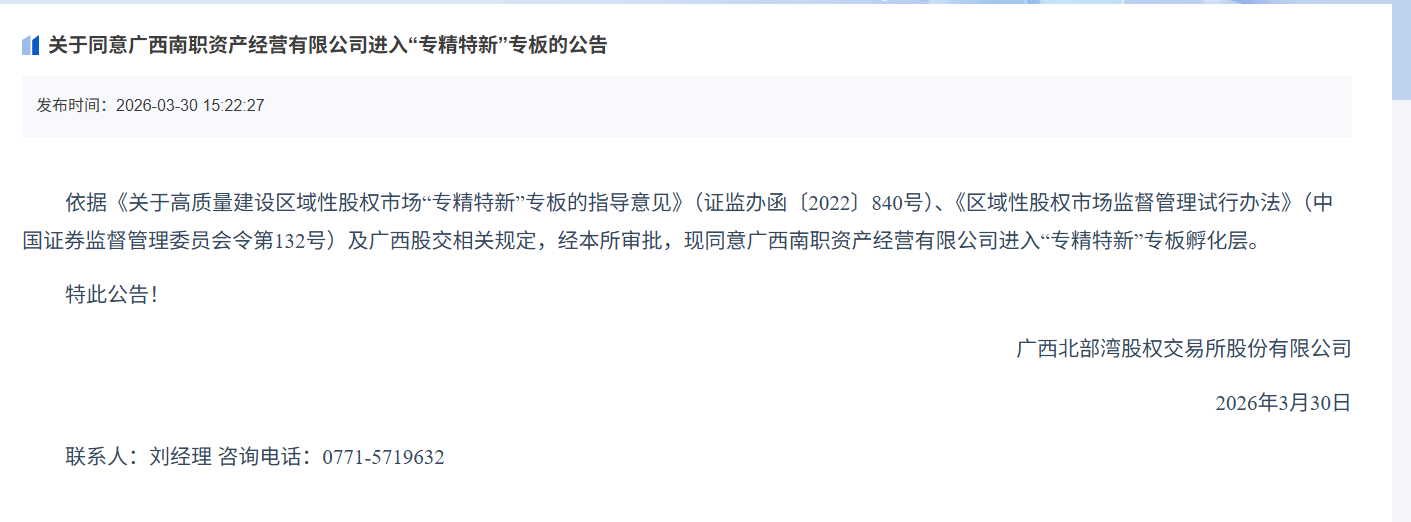 近日,经广西北部湾股权交易所正式审核批准,广西南职资产经营有限公司成功进入“专精特新”专板孵化层,进入后公司获得自治区金融办5万元的资金奖励和后续的政策支持。